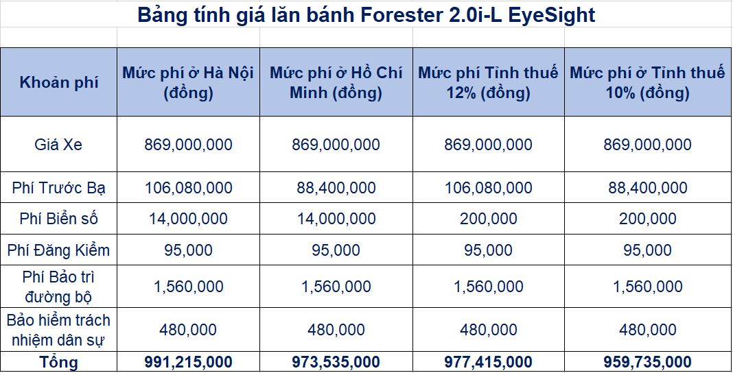 Bảng giá lăn bánh Subaru Forester 2025 tại Hà Nội, Hồ Chí Minh và các tỉnh